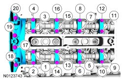 Stage 1: Tighten the bolts evenly, half a turn at a time, until the camshaft bearing caps and the VCT (Variable Camshaft Timing) bridge are seated against the cylinder head.