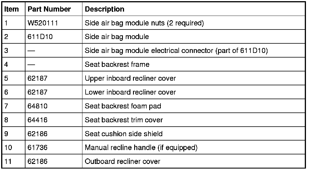 NOTE: When replacing the side air bag after deployment, refer to Seats for additional information concerning new side air bag installation.
