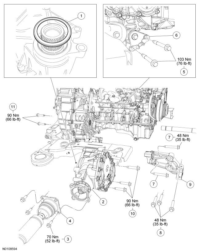 - Tighten the engine roll restrictor-to-transaxle bolts to 103 Nm (76 lb-ft).