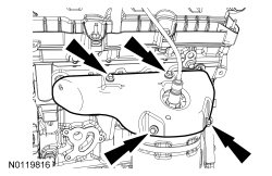 NOTICE: During engine repair procedures, cleanliness is extremely important. Any foreign material, including any material created while cleaning gasket surfaces that enters the oil passages, coolant passages or the oil pan, may cause engine failure.