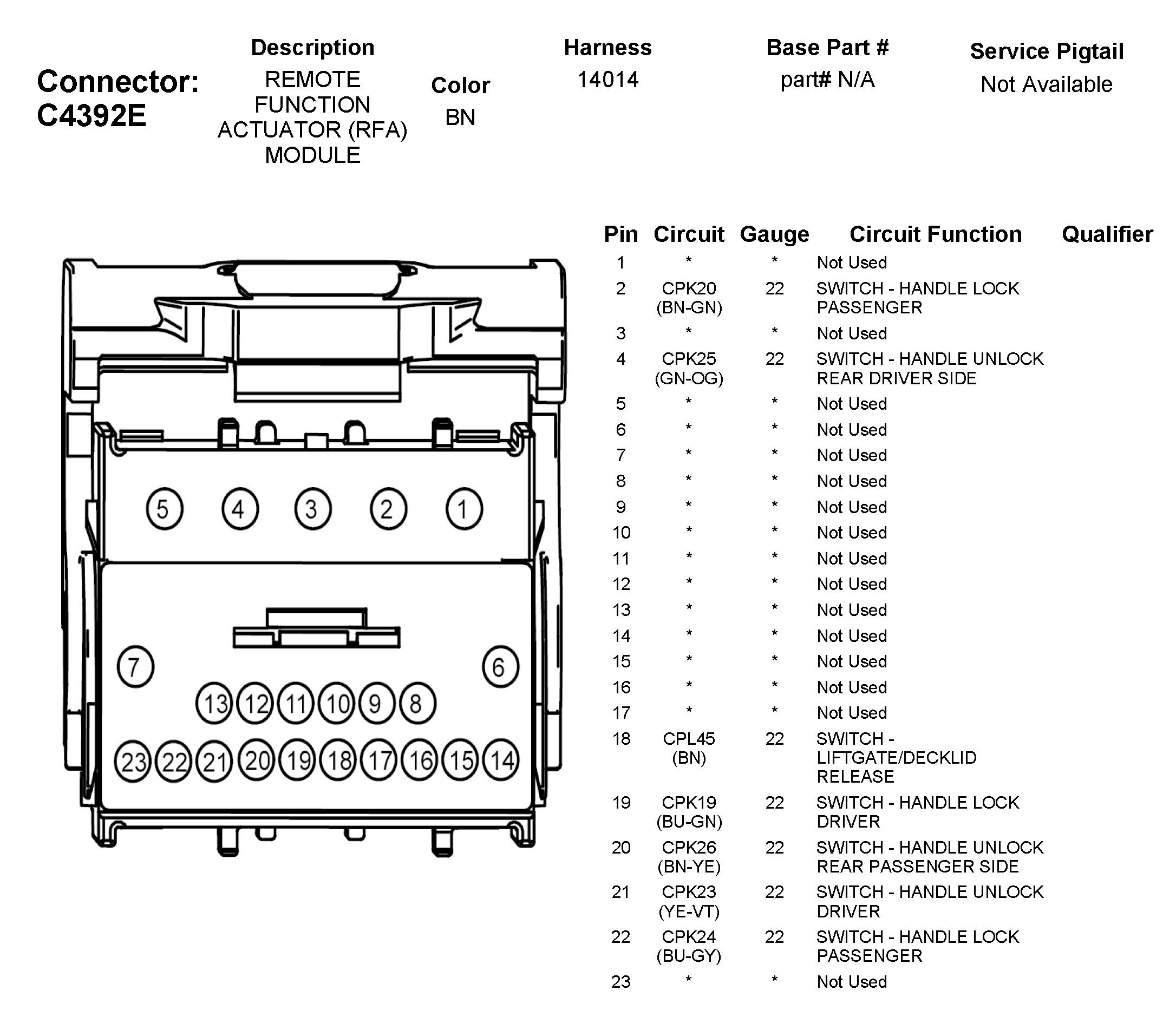 Home >> Ford >> 2012 >> Focus ELE-Electric Engine >> Repair and Diagnosis >> Starting and Charging >> Starting System >> Keyless Starting System >> Keyless Start Transmitter >> Diagrams >> C4392E Remote Function Actuator (RFA) Module