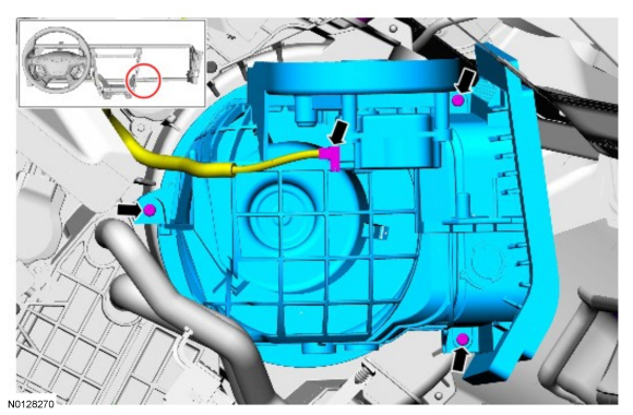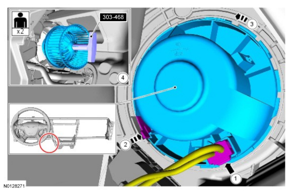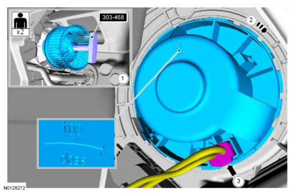 1. Install 303-468 (T94P-6510-AH) on the blower motor hub, insert the blower motor through the air inlet duct opening and align the blower motor with the heater core and evaporator core housing.