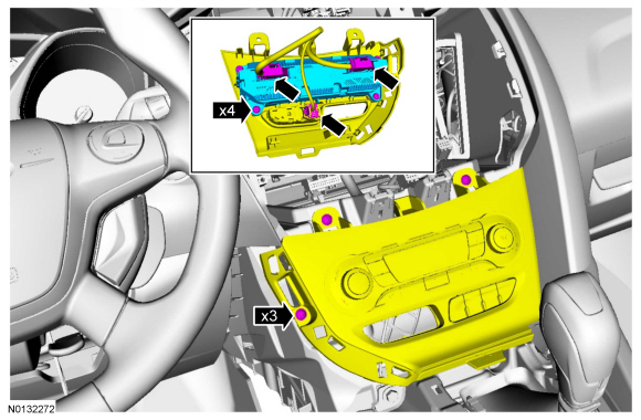 8. Remove the 3 lower finish panel screws, disconnect the 2 HVAC (Heating, Ventilation, and Air Conditioning) electrical connectors remove the lower finish panel. Remove the 4 HVAC (Heating, Ventilation, and Air Conditioning) module screws and remove the HVAC (Heating, Ventilation, and Air Conditioning) module.