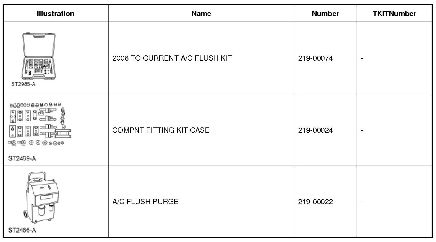 NOTICE: Only the listed A/C (Air Conditioning) Flush and Purge Machine, A/C (Air Conditioning) Flush and Purge Fitting Kit, A/C (Air Conditioning) Flush Adapter Kit and Motorcraft(R) A/C System Flushing Solvent are approved for use on Ford vehicles. No other flushing device or solvent is approved for flushing heat exchangers (A/C (Air Conditioning) condenser, A/C (Air Conditioning) evaporator). Use of any other flusher or solvent may cause damage to the A/C (Air Conditioning) system and the flushing unit.