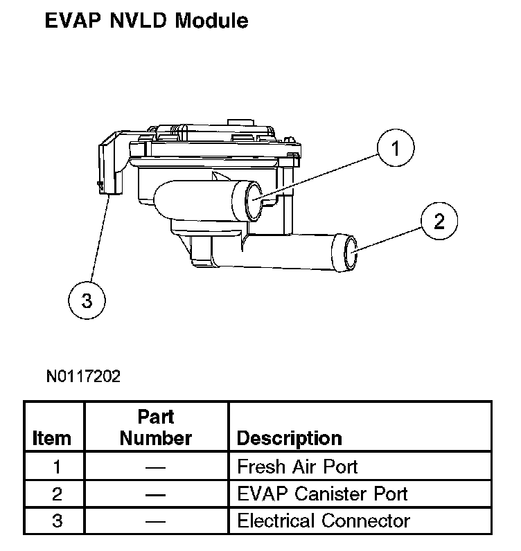 Internal to the NVLD module is a normally open vacuum switch (closes with vacuum), a normally closed vacuum relief valve (opens with excessive vacuum), a normally closed pressure relief valve (opens during refueling), an internal ambient air temperature sensor and a timer. The NVLD module completes a series of checks to confirm the integrity of the enhanced EVAP system components in the engine running state and the ignition OFF state. When the ignition is turned ON and the engine is running the NVLD module sends the information stored during the ignition OFF tests to the PCM.