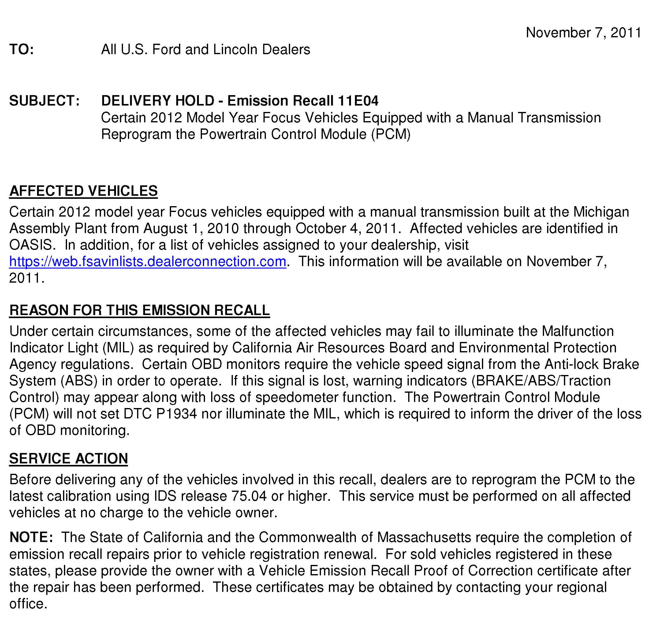 Recall - ECM Update For OBD Compliance