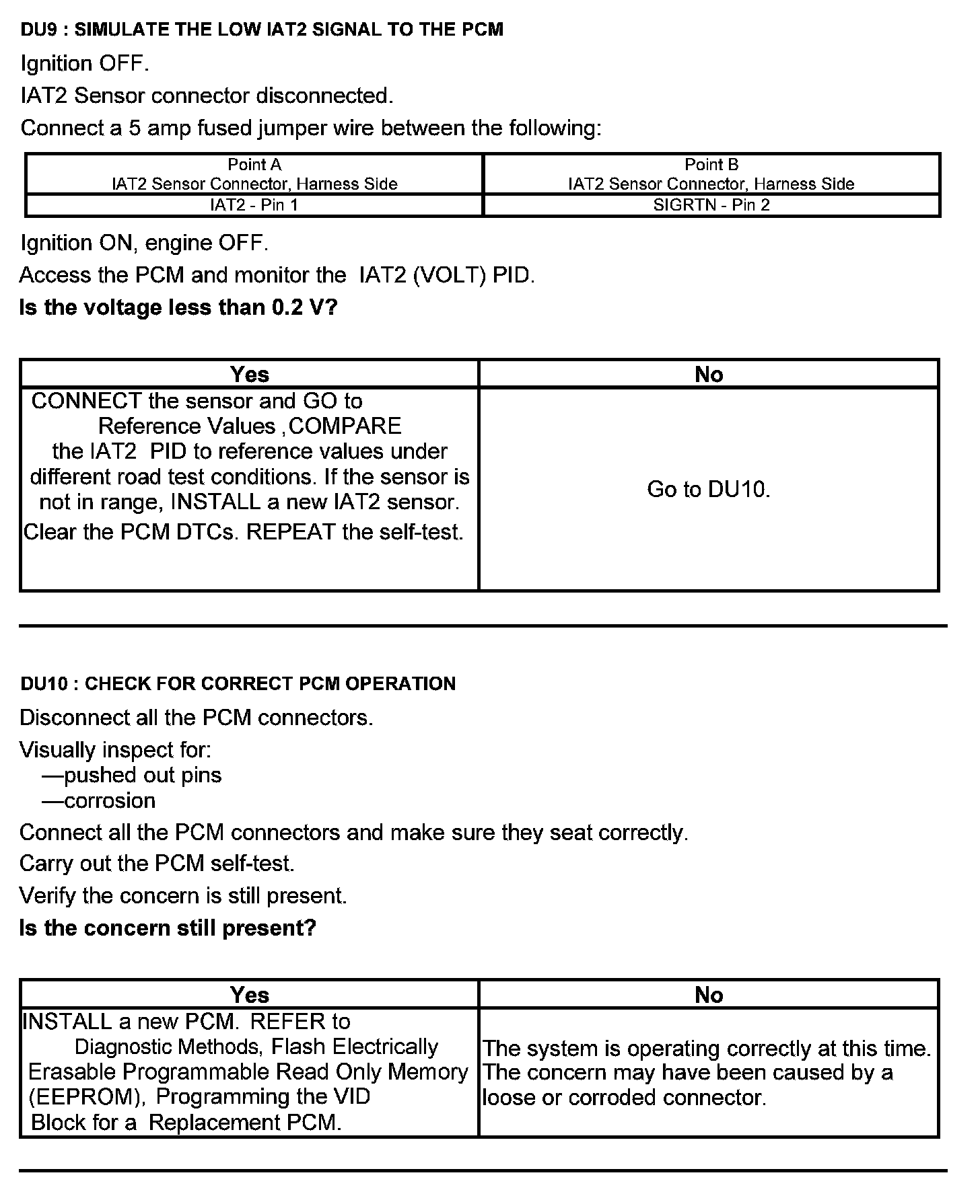 Home >> Ford >> 2012 >> Focus L4-2.0L >> Repair and Diagnosis >> Powertrain Management >> Computers and Control Systems >> Testing and Inspection >> Pinpoint Tests >> Test DU: Intake Air Temperature 2 (IAT2) Sensor