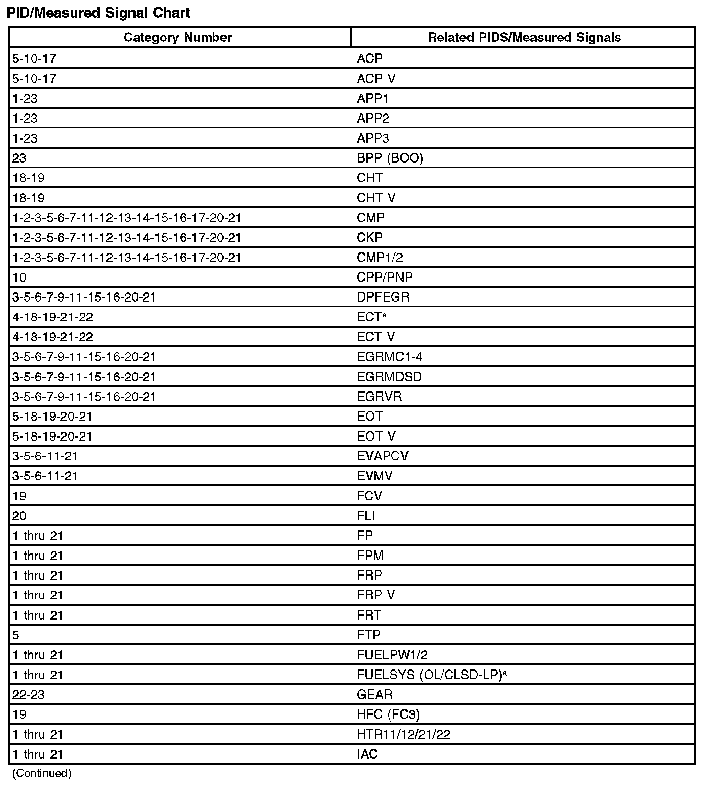 The following listing reflects PIDS and/or measured values which may reveal a possible concern within each system shown. Match the category number with the related PID/measured signal and go to the Typical Diagnostic Reference Value Charts. Typical Diagnostic Reference Values