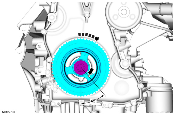 5. Turn the crankshaft until piston no.1 is 45 degrees before TDC (Top Dead Center) by using the guide holes on the engine front cover and the crankshaft pulley.