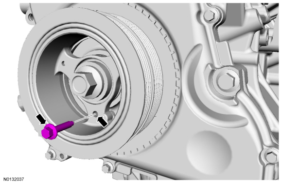 Install a 6 mm x 18 mm standard bolt through the crankshaft pulley TDC (Top Dead Center) guide hole and into the engine front cover TDC (Top Dead Center) guide hole..