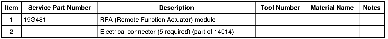 NOTE: If installing a new RFA (Remote Function Actuator) module, the ignition cannot be turned on until a parameter reset is performed and 2 keys are programmed to the vehicle. The RFA (Remote Function Actuator) module still communicates with the scan tool with the ignition off. Use the previous scan tool session or start a scan tool session using the PCM (Powertrain Control Module) part number or tear tag.