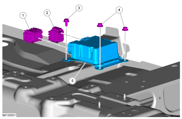 1. Position the RCM (Restraints Control Module) under the floor console.