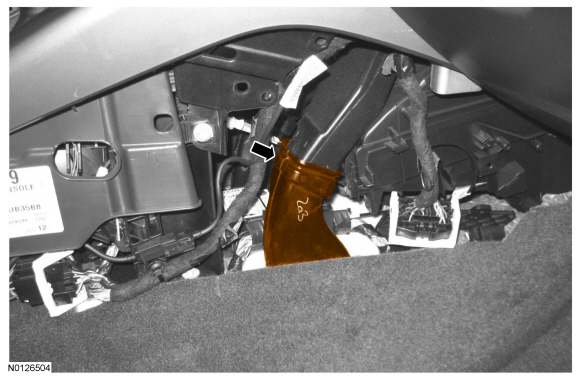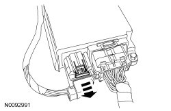 7. Press the tab and disconnect the small RCM (Restraints Control Module) electrical connector.