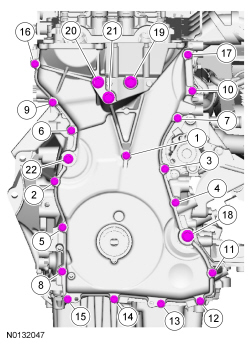 Position the engine front cover and tighten the 22 engine front cover bolts in the sequence shown.