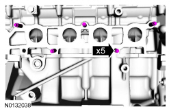 Using a new gasket, position the catalytic converter and install the 5 catalytic converter manifold-to-cylinder head nuts and tighten in 2 stages in the sequence shown.