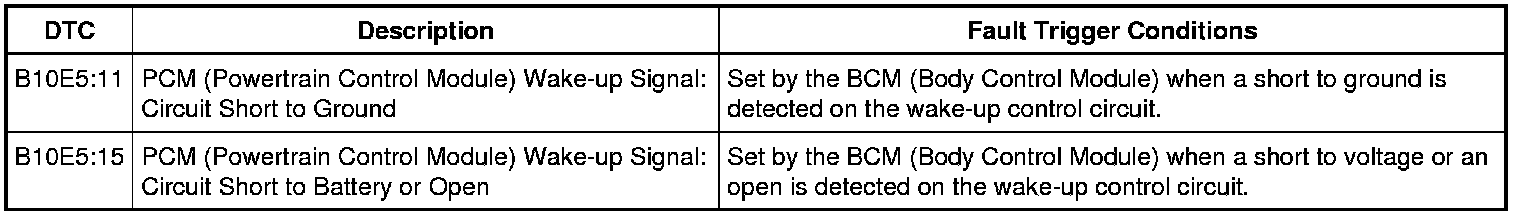 The wake-up control circuit wakes up the PCM (Powertrain Control Module) prior to engine cranking. The PCM (Powertrain Control Module) needs to wake up prior to a crank request so it has time to go through its initialization. The wake-up control circuit is controlled by the BCM (Body Control Module).