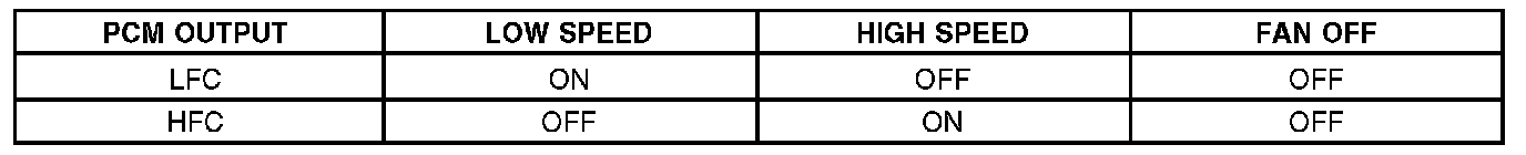 For 2-speed fans, although the PCM output circuits are called low and high fan control, cooling fan speed is controlled by a combination of these outputs. Refer to the following tables.