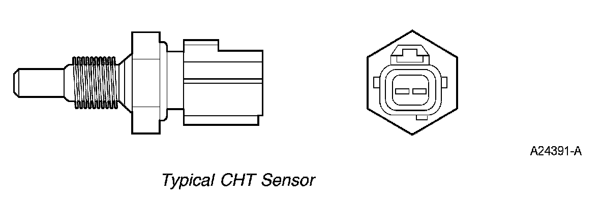 The CHT sensor is a thermistor device in which resistance changes with the temperature. The electrical resistance of a thermistor decreases as temperature increases, and the resistance increases as the temperature decreases. The varying resistance affects the voltage drop across the sensor terminals and provides electrical signals to the PCM corresponding to temperature.