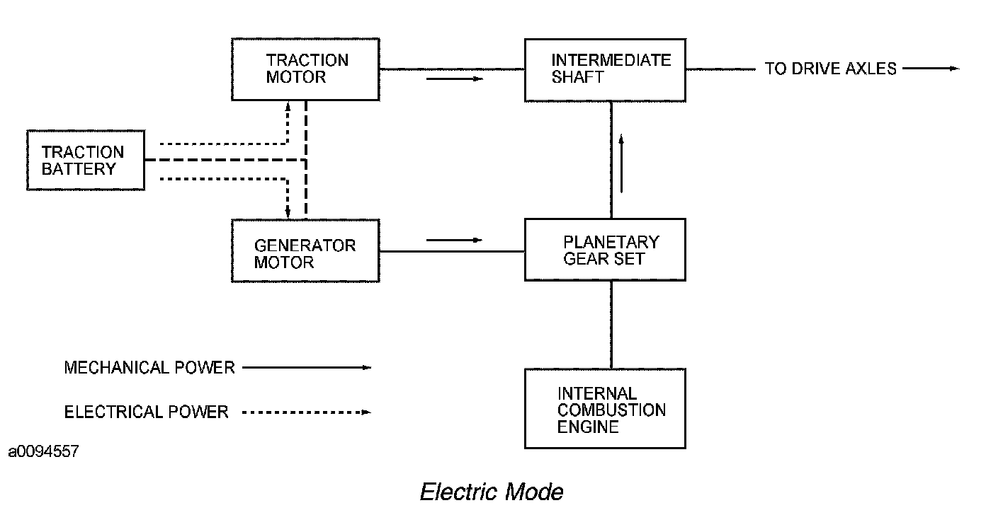 The hybrid electric system operates in the electric mode when the vehicle is propelled by the electrical power stored in the high voltage traction battery. The torque is supplied to the output shafts by the traction motor, the generator motor, or a combination of both. This is a preferred mode whenever the desired torque is low and the electrical system, rather than the engine, can produce it more efficiently. The electric mode is also used in reverse because the engine can deliver torque only in a forward direction.