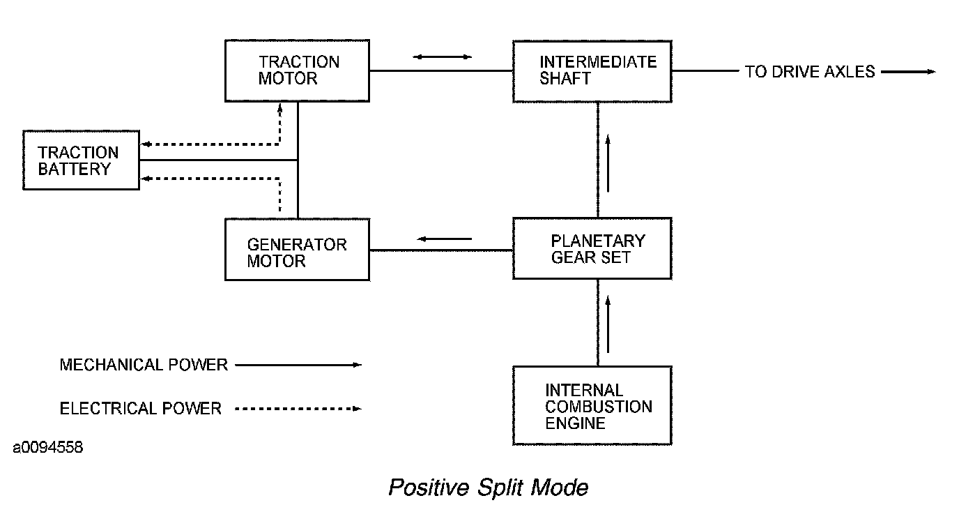 In this mode the internal combustion engine is running and powering the generator motor which produces the electricity. The power from the engine is split between the path through the generator motor and the path to the output shafts of the vehicle. The electricity produced by the generator motor charges the high voltage traction battery or powers the traction motor. In this mode the traction motor can operate as a motor or as a generator to make up the difference between engine power and desired power at the wheels. This mode is preferred whenever the traction battery needs to be charged.