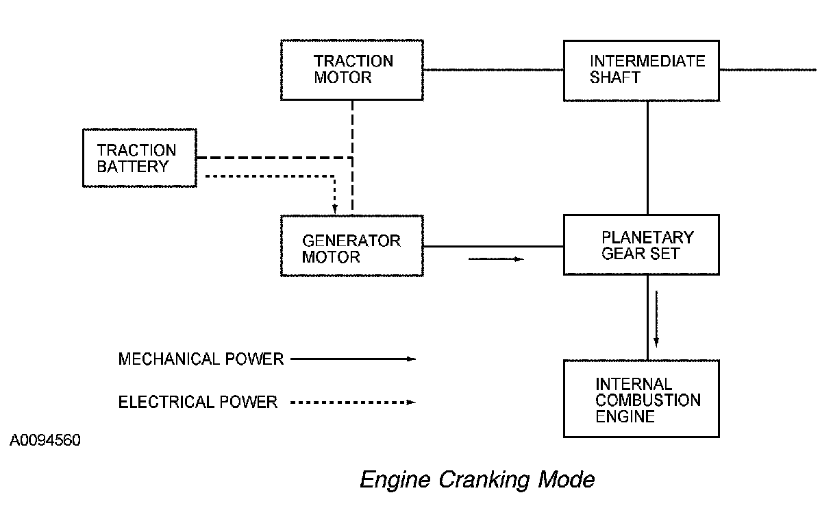 The electronically controlled CVT provides the engine cranking function to start or restart the internal combustion engine. When the PCM requests the engine cranking mode, the generator motor rapidly accelerates the engine speed up to about 950 RPM in about 0.3 seconds. When the engine speed reaches a calibrated speed the PCM commands the delivery of fuel and spark at the appropriate times.