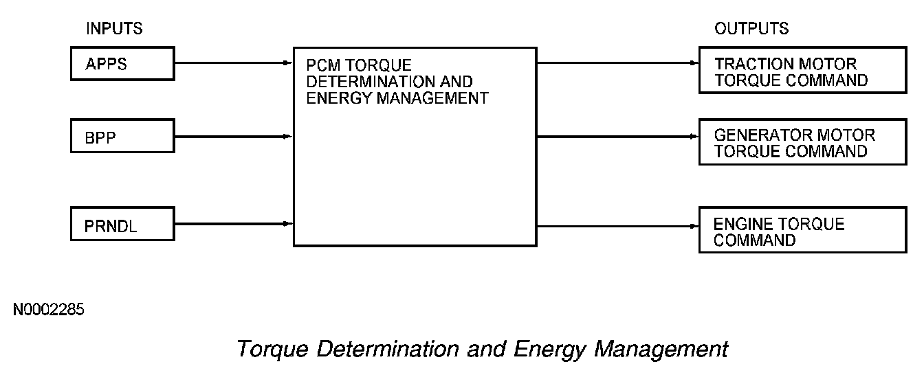 The PCM is responsible for torque determination and energy management functions. The PCM monitors gear selector position (PRNDL), brake pedal position (BPP) and accelerator pedal position (APP). The PCM then makes a torque command determination. Positive torque is perceived as vehicle acceleration and negative torque is perceived as braking. Based on the amount of torque requested by the driver, the PCM decides which power source has to deliver the torque to meet the driver demand while the powertrain system is running most efficiently.