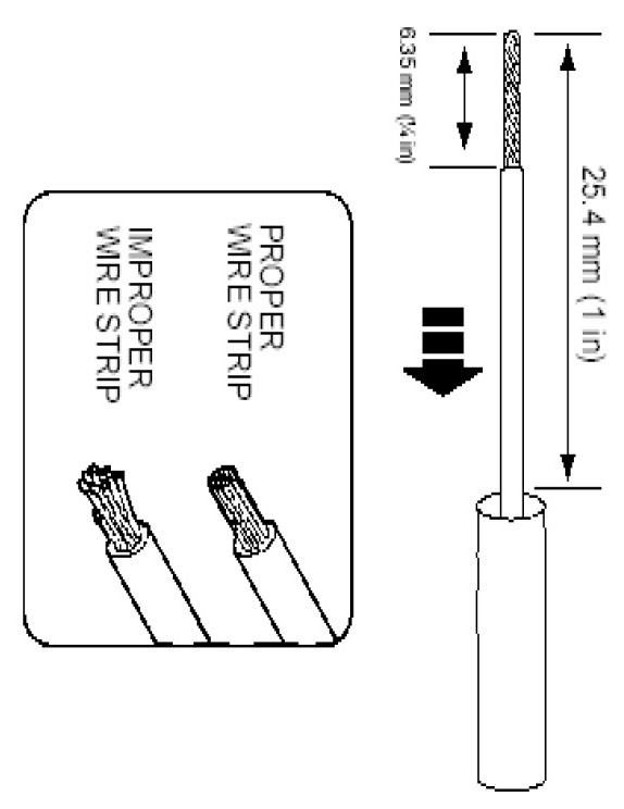 2. Strip 6.35mm (1/4 in) of insulation from each wire end, taking care not to nick or cut wire strands.