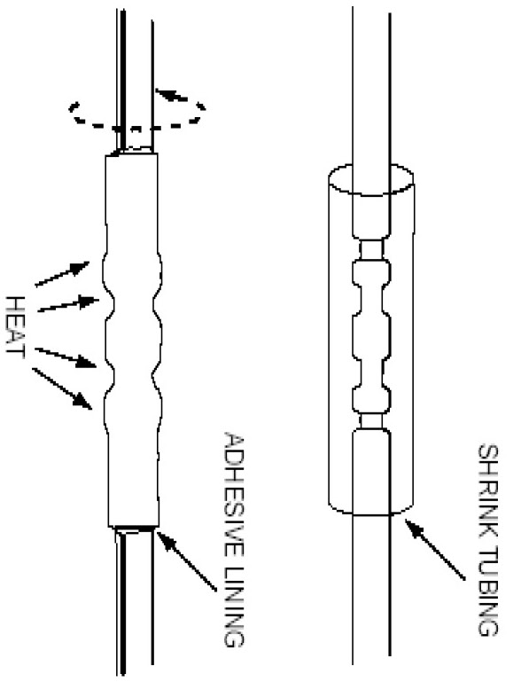 13. Use shielded heat gun to heat the repaired area until adhesive flows out of both ends of the heat shrink tubing.