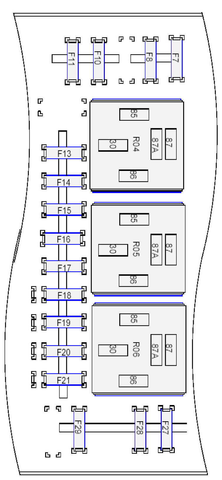 Fuse/Locations and Relay/Locations contains a view of the fuse/relay box, in which all fuses and relays are identified, numbered and named. Fuse and relay numbering and naming follow the indication of the fuse panel cover. In addition, for all removable relays, pin positions are added to illustrate proper orientation.