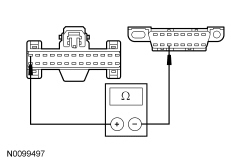 - Measure the resistance between the SJB (Smart Junction Box) C2280B-38, circuit VDB07 (VT/OG), harness side and the DLC (Data Link Connector) C251-11, circuit VDB07 (VT/OG), harness side.