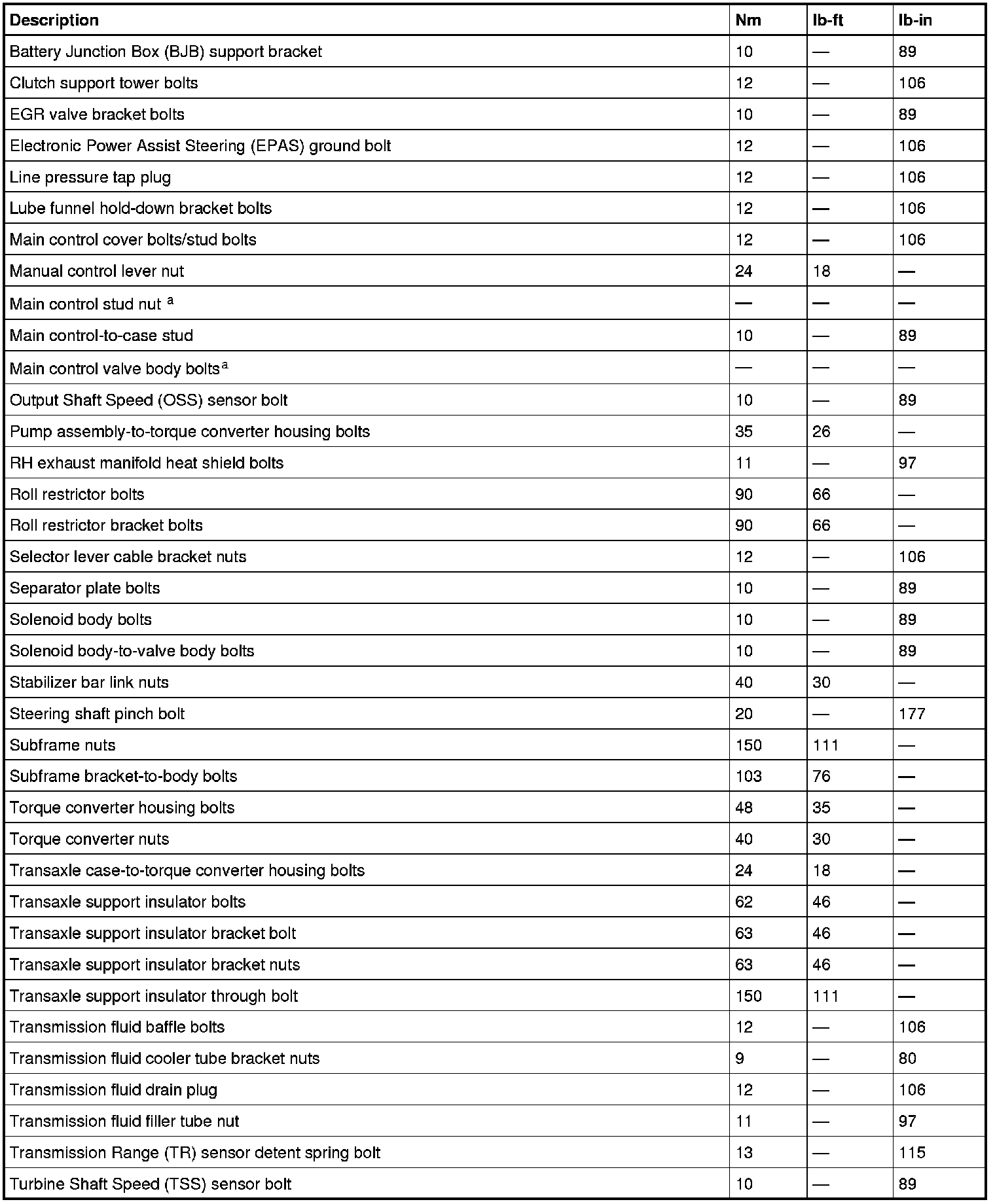 Home >> Ford >> 2012 >> Fusion FWD L4-2.5L >> Repair and Diagnosis >> Specifications >> Mechanical Specifications >> Automatic Transmission/Transaxle >> System Specifications >> Automatic Transaxle/Transmission - 6F35