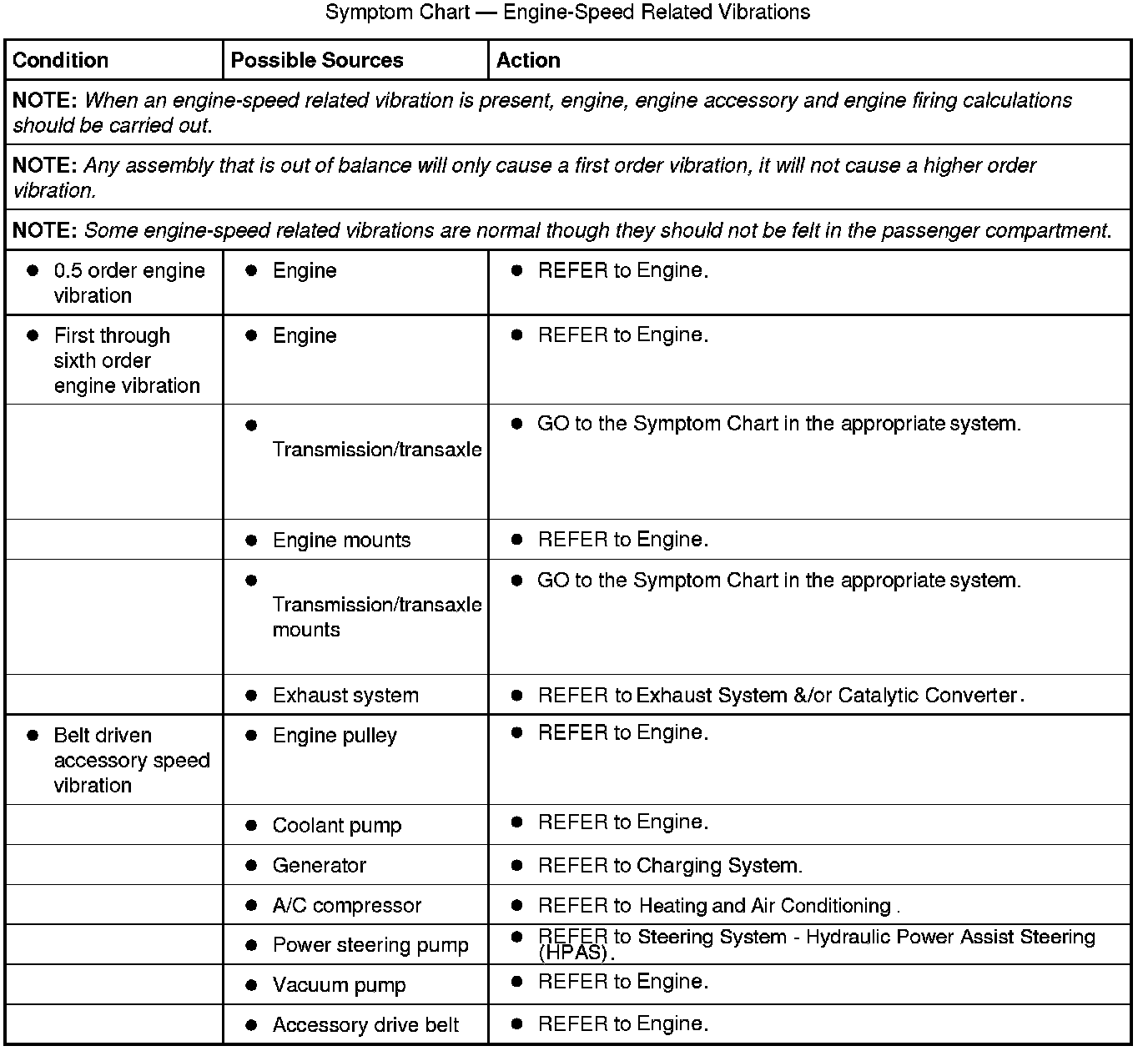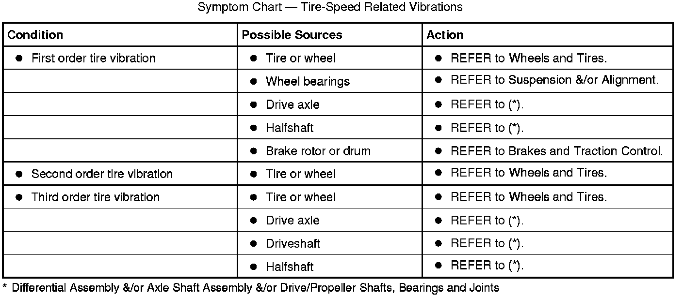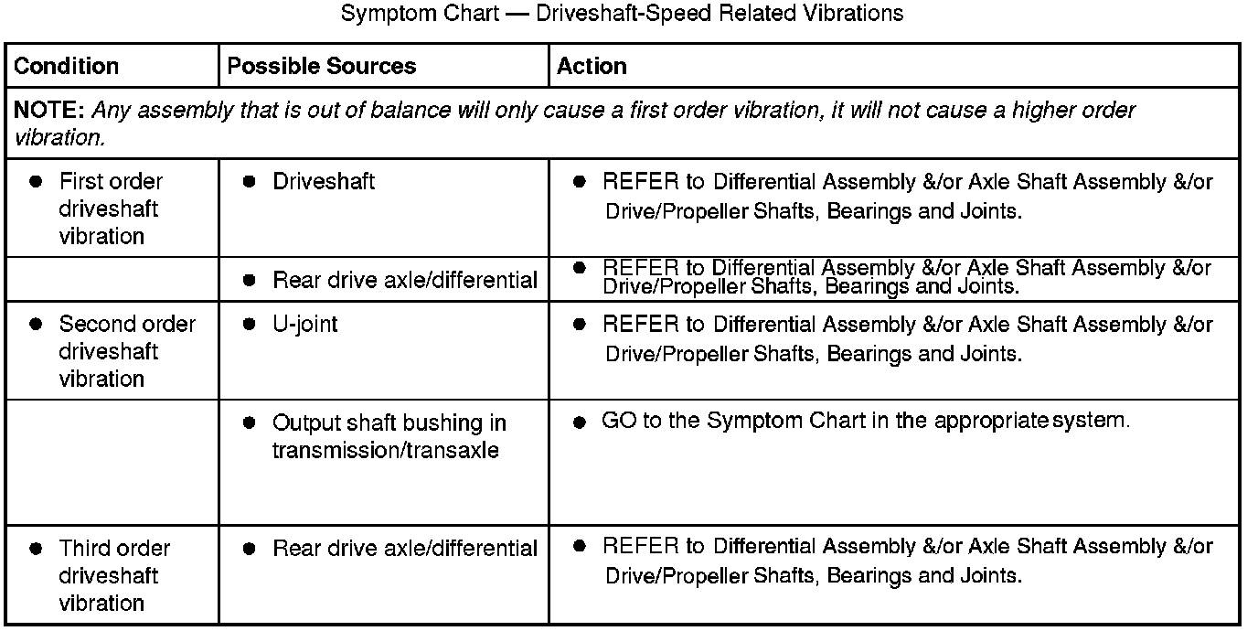 Use the diagnostic instructions along with the necessary listed tools to identify the vibration order and to isolate the symptom and the possible systems associated with that symptom. Then based on the results from the road test, make a determination of which action in the symptom chart to take first. Since it is possible any one of multiple systems may be the cause of the symptom, it may be necessary to use a process of elimination type diagnostic approach to pinpoint the concern. Refer to the system(s) indicated to identify and isolate the cause or rule that system out as being the causal system for the symptom.