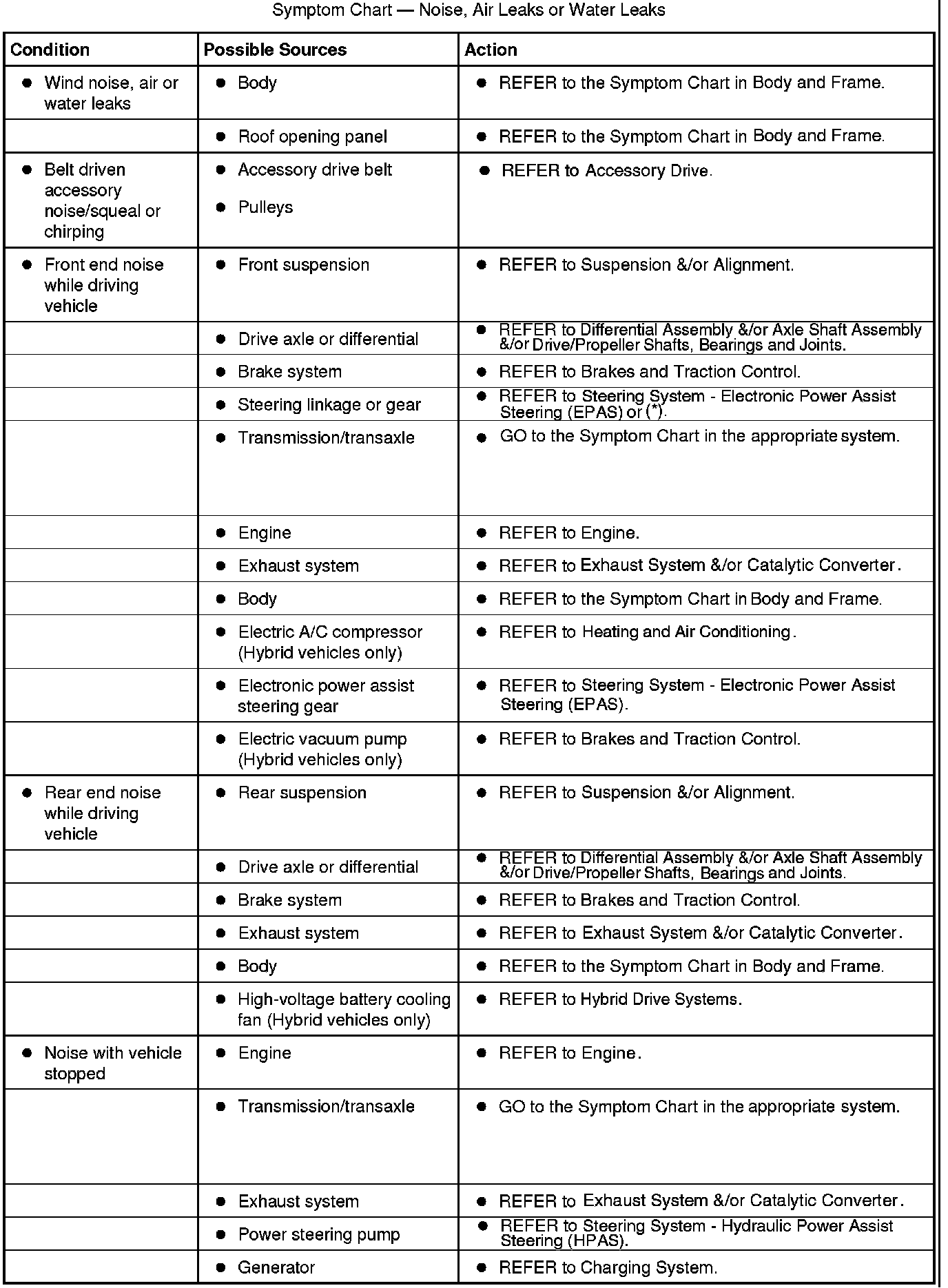 Once a symptom is classified as a noise, the particular conditions under which the noise occurs need to be identified. These conditions are identified and verified during the road test. For example, a noise may only occur while turning. The next step is to determine which systems on the vehicle are related to that condition. In this case, the steering system and wheel/tire system may be suspect. After identifying possible systems, a preliminary inspection of these systems should be done. If the source of noise is still unidentified, use a listening device (such as the ChassisEAR) to pinpoint the source. Once the source has been identified, determine if this source is related to the suspected system previously identified. If it is related, then complete the repair to resolve the customer concern. If it is unrelated, then it is possible that the source of the noise is a reactor to a noise being transmitted through a transfer path. If this is the case, repairing the reactor will not resolve the customer concern. The transfer path must be identified and a determination made if the noise is normal, but accentuated by the transfer path (conductor), or if the originator is the fault causing excessive noise to transfer to another component through a conductor. There is a relationship between systems identified as related to conditions and the noise transfer path. In some cases, the condition under which the noise occurs has nothing to do with the identified source. This relationship is important in the diagnosis of noise concerns. It is the first clue that the identified source of noise might be a reactor and that further investigation is needed to diagnose a possible noise transfer path concern. Based on the results from the road test, make a determination of which action in the symptom chart to take first.