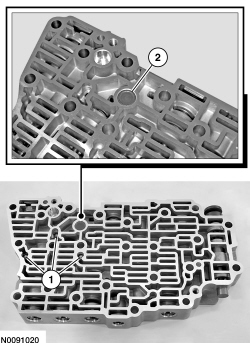 Compress the valve springs with a screwdriver and remove the retainers with a magnet. Use a pick to remove the bypass valve retainer. Remove the individual valves and springs from the main control valve body by tapping the valve body on the palm of the hand to slide the valves out of the bores. If needed, use a 4-mm bolt to thread into the valves to remove the valves. See the Valve Body illustration for valve and spring locations. Clean valves, springs and main control valve body.
