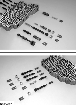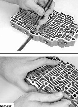 5. NOTICE: Remove the valves by tapping the valve body on the palm of the hand to slide the valves out of the bores or by threading a 4-mm bolt into the valves and pulling them out. It may be necessary to remove the valves and springs using a pick. If it is necessary to use a pick, use extreme caution to prevent damaging the valves or valve bores. If necessary, disassemble parts of the main control valve body in small groups. Take special care when handling the main control components, since they are the most precise and delicate parts of the transaxle. Neatly arrange the parts as they are removed to avoid mixing similar pieces.