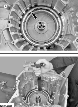 19. NOTICE: Be sure the snap ring is aligned with the gap facing the front of the transaxle or damage to the transaxle can occur. The front of the transaxle is where the low/reverse and forward (1, 2, 3, 4) clutch hydraulic ports are located.