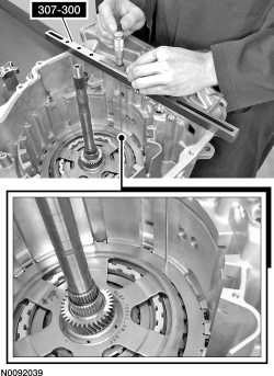34. Using a suitable depth gauge, measure and record as measurement A, the distance from the Shim Selection Gauge 307-300 to the top of the intermediate (2, 6) clutch pack at 3 different points and average the 3 distances.