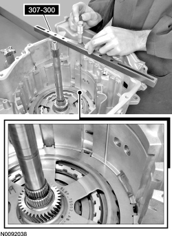 35. Using a suitable depth gauge, measure and record as measurement B, the distance from the top of Shim Selection Gauge 307-300 to the transaxle case step above the intermediate (2, 6) clutch.