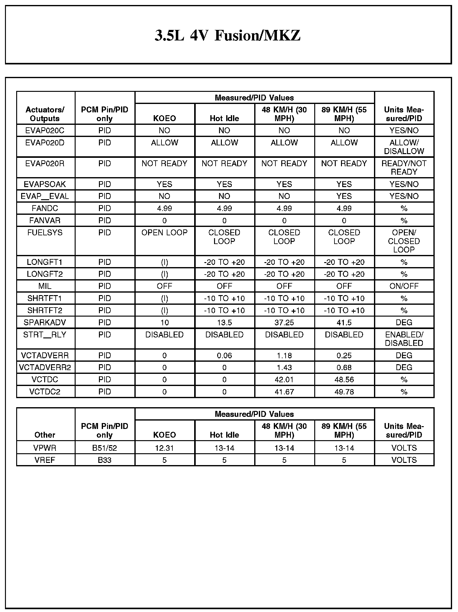 Home >> Ford >> 2012 >> Fusion FWD V6-3.5L >> Repair and Diagnosis >> Powertrain Management >> Computers and Control Systems >> Testing and Inspection >> Scan Tool Testing and Procedures >> Typical Diagnostic Reference Values