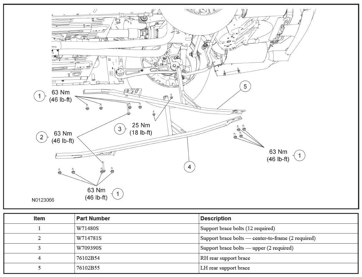 1. Tighten the 4 rear support brace bolts (front) to 63 Nm (46 lb-ft).