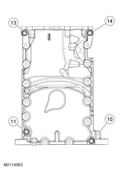 Install the oil pan and bolts 10, 11, 13 and 14 finger tight.