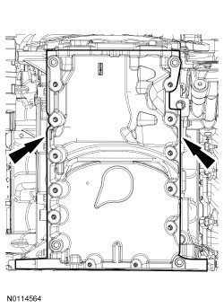 31. Apply a 5.5 mm (0.21 in) bead of Motorcraft(R) High Performance Engine RTV Silicone to the 2 crankshaft seal retainer plate-to-cylinder block joint areas on the sealing surface of the oil pan.