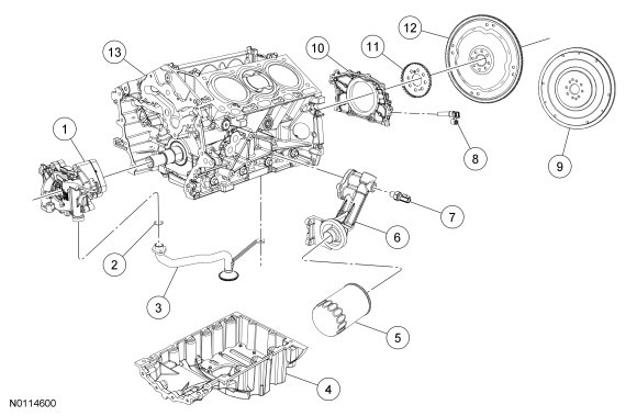 Apply a 3 mm (0.11 in) bead of Motorcraft(R) High Performance Engine RTV Silicone to the sealing surface of the oil pan-to-engine block mating surface.