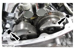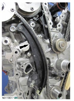 Compress the LH secondary timing chain tensioner and remove the Secondary Chain Hold Down.