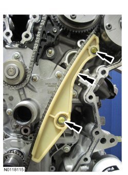 95. Install the lower LH primary timing chain guide and the 2 bolts.