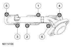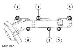 115. NOTICE: Failure to tighten the exhaust manifold nuts to specification a second time will cause the exhaust manifold to develop an exhaust leak.