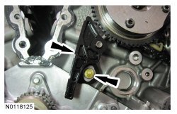 98. NOTE: It may be necessary to rotate the camshafts slightly to remove slack from the timing chain to install the tensioner.