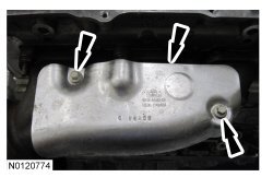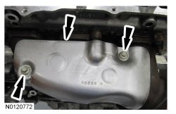 116. Install the RH exhaust manifold heat shield and the 2 bolts.