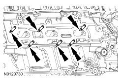 NOTICE: During engine repair procedures, cleanliness is extremely important. Any foreign material, including any material created while cleaning gasket surfaces that enters the oil passages, coolant passages or the oil pan, may cause engine failure.