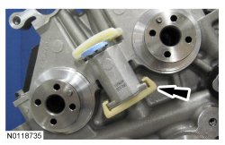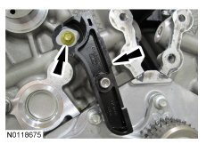 13. Remove and discard the LH secondary timing chain tensioner shipping clip.